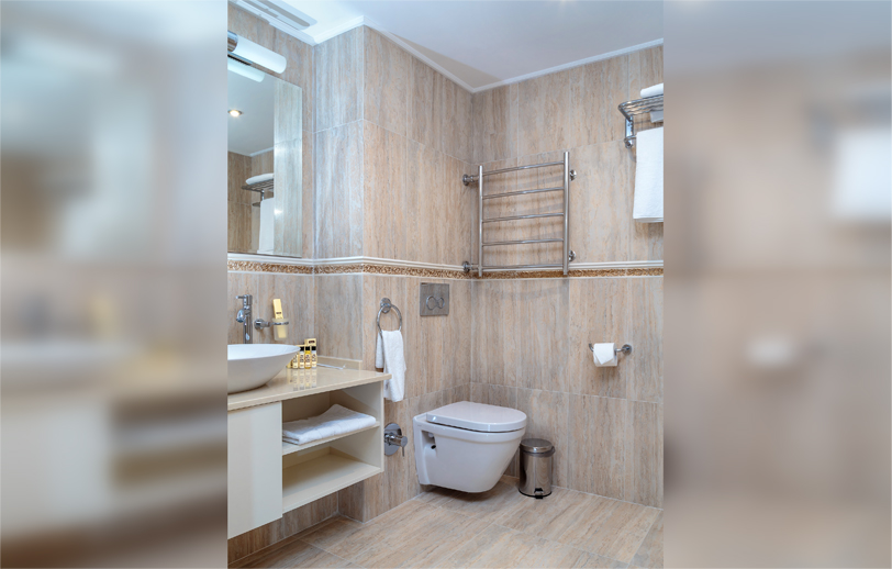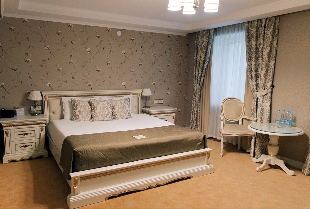У нумары ёсць ложак King size памерамі 2000*1800 з артапедычным матрацам, тэлевізар, стол, сейф з электронным замком, кандыцыянер, міні-бар за дадатковую плату, пітная вада, ванны пакой з душам, ўнітаз з функцыяй бідэ, касметычныя сродкі, фен, халат, тапачкі.